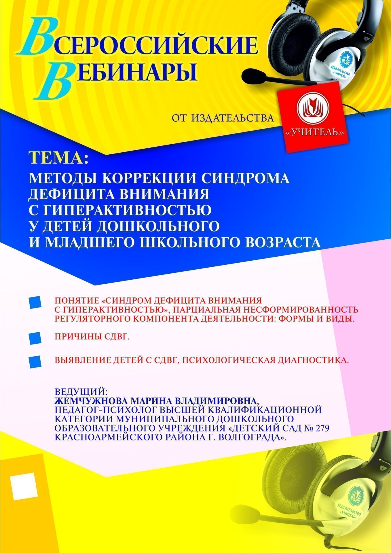 Приглашаем учителей-логопедов, учителей-дефектологов, педагогов коррекционных ОО, специальных педагогов, учителей начальной школы, педагогов-психологов, методистов, воспитателей ДО принять участие в offline-вебинаре «Методы коррекции синдрома дефицита внимания с гиперактивностью у детей дошкольного и младшего школьного возраста».