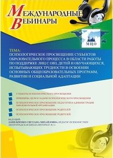 Международный вебинар "Психологическое просвещение субъектов образовательного процесса в области работы по поддержке лиц с ОВЗ, детей и обучающихся, испытывающих трудности в освоении основных общеобразовательных программ, развитии и социальной адаптации"