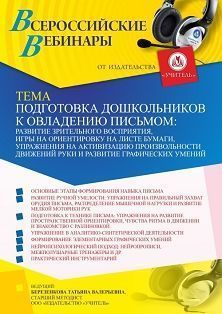 Вебинар Подготовка дошкольников к овладению письмом: развитие зрительного восприятия, игры на ориентировку на листе бумаги, упражнения на активизацию произвольности движений руки и развитие графических умений